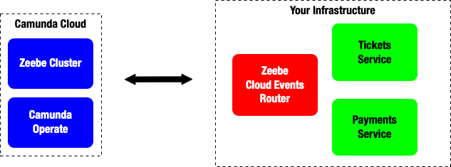 Notice how both services are referencing the Zeebe Cloud Events router to be able to interact with it.