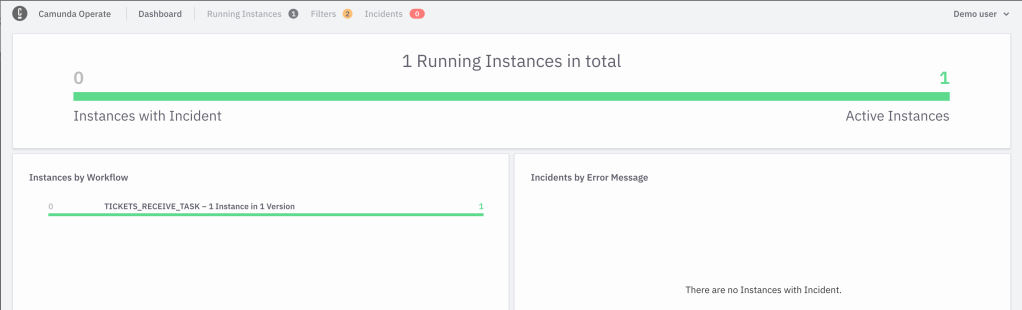 Now you can point your browser to http://localhost:8081 and use Operate to see which workflows are available and how many executions do you have in your environment. User: demo, Password: demo.