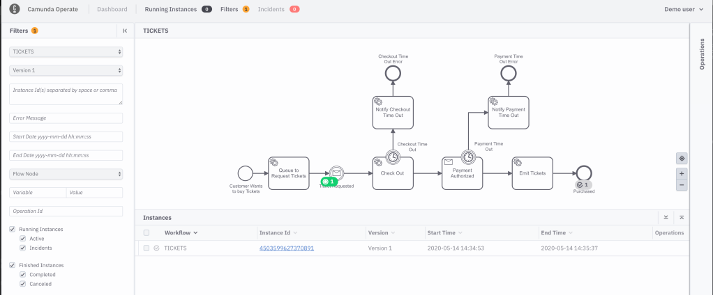 In Operate you will see the token moving forward until the workflow complete.