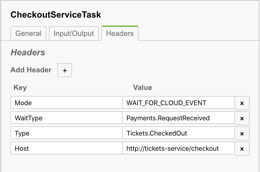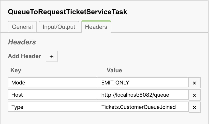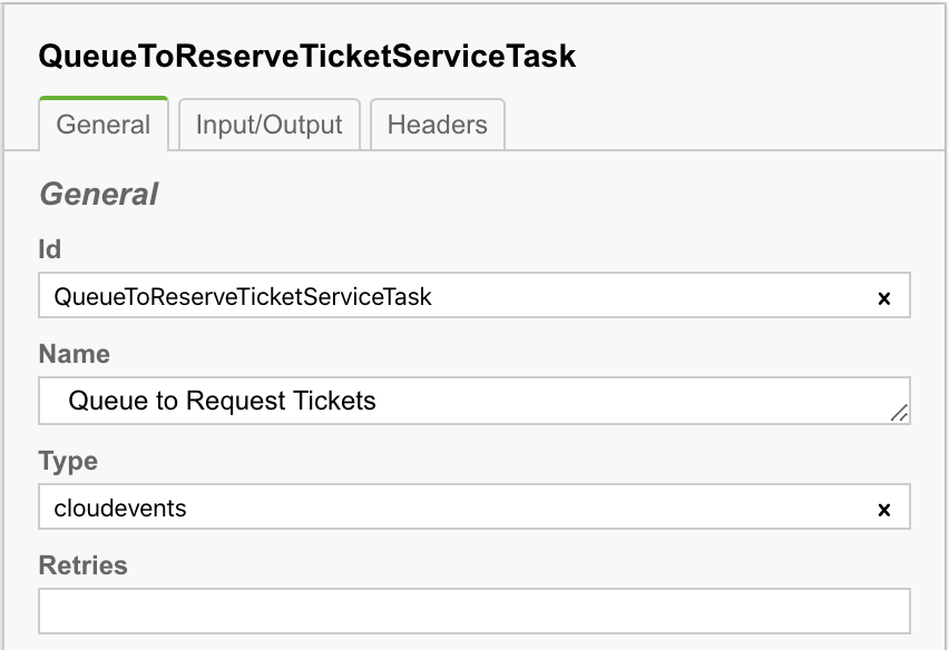 For example, if we want to emit a Cloud Event, the Queue To Request Tickets Service Task defines the following properties and headers: