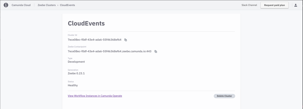 After signing up for an account in Camunda Cloud(Beta) you can create a Zeebe cluster in self-service. I’ve created one called CloudEvents: