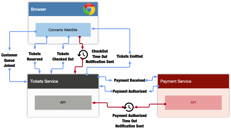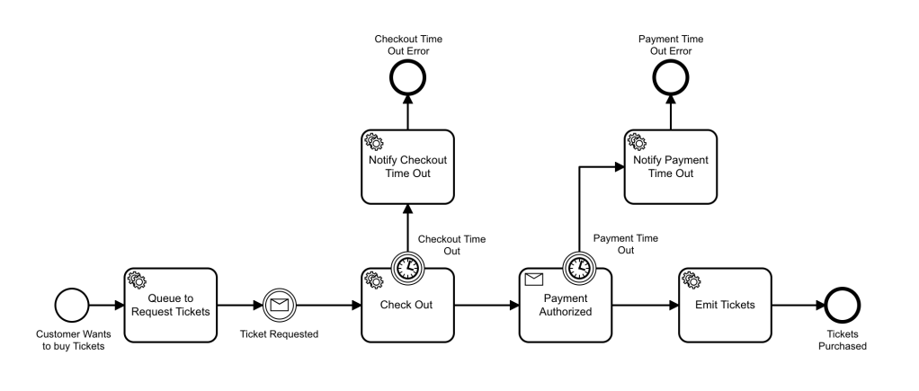 - Notifications.Requested: A notification was sent to the customer. In our example, this can happen due to time outs while checking out the tickets or due time out from the payment service while authorizing the payment.