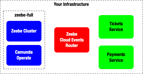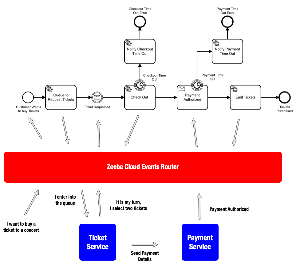 This diagram is not imposing any runtime constraints about where the Services should be or how to interact with them, it is only defining what the sequence of these events should be and, for example, when to emit certain events. Both the Tickets Service and the Payments Service can be running in the Cloud, On-Prem, with or without containers. Zeebe can orchestrate these events to make sure that ticket purchase events are tracked correctly.
