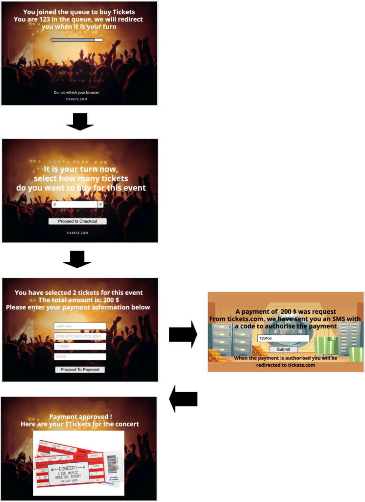 In the backend, there will be a service in charge of queuing customers that want to buy tickets and a payment service in charge of processing the payments. Due to the high demand, timeouts need to be in place to make sure that customers that are not willing to buy the tickets get removed from the queue if they spend too much time deciding.