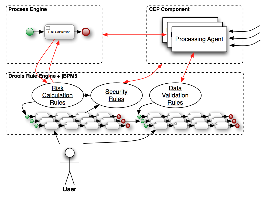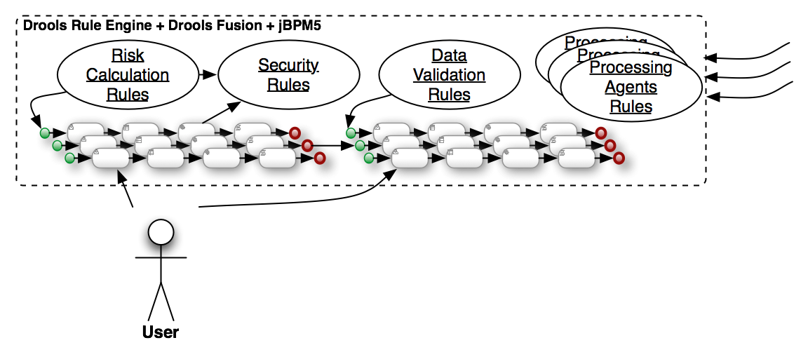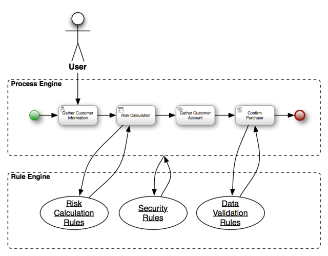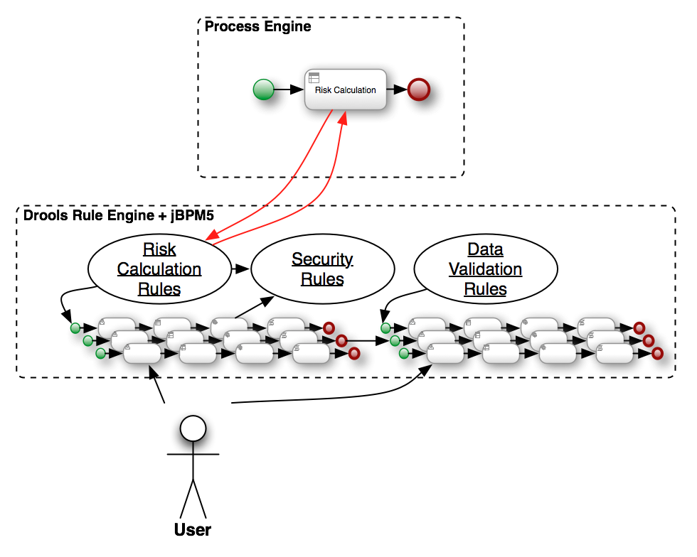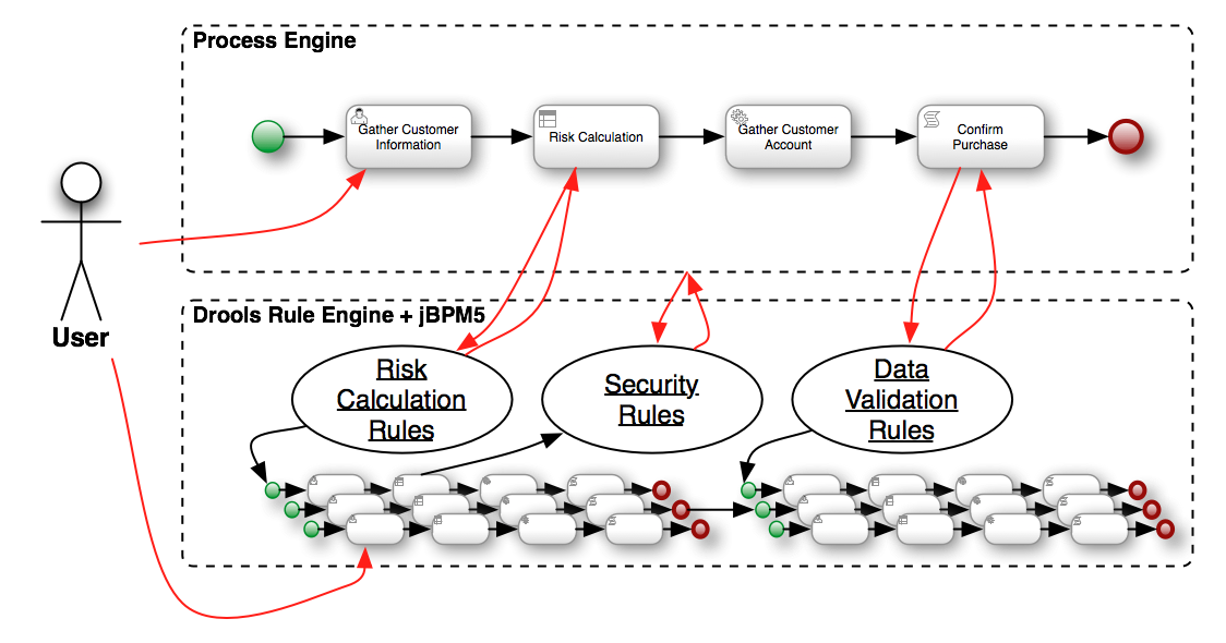 In all the jBPM5 & Drools Community training that I gave during this year, I took about an hour discussing about the classic integration between a BPM System and Rule Engines. The strongest point in my perspective is the fact that most of the BPM Systems out there do a very poor integration with a Rule Engine (by the way, most of them integrates with Drools). Most of them just use a Rule Engine for Decision Points inside the process or to do some Data Validation. Most of the time this interaction is completely stateless by nature and the inferences capabilities of the Rule Engine are not used at all.