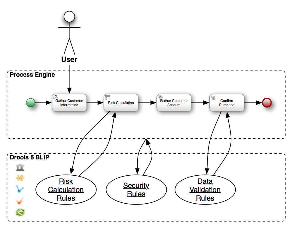 Hmm.. it looks OK!, the integration seems right.. The problem starts when a Smart Developer, having smart developers usually cause troubles :), notice that if they are using Drools 5 as a Rule Engine, they get jBPM5 for free and they can start running processes inside the Business Logic Integration Platform. So.. They start to wonder.. why do I need my original BPM System, if I have jBPM5 fully integrated with Drools and I can avoid moving data all around, calling slow web services that needs to marshal complex structures into XML each time that I want to interact? This is a very long question, but a very valid one :)