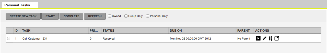 The Tasks List screen will allows us to interact with the tasks assigned to us or to the groups where we are included. As you can notice in the previous screen, my user (salaboy) was included inside the [Writer] group. This means that all the Tasks associated to the Writer group will appear in my personal task list. Notice that for each row inside the list we will have a set of actions to interact with each task. The following screenshot shows the Start button inside the Actions column, we can also edit/view the Task Details and we can also access to work on that particular task via it associated Task Form.