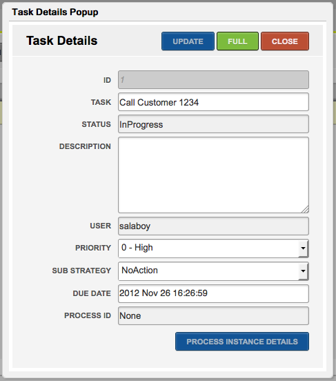 The Task Details popup allows us to see the most important information about the a particular task. If we want to access to a more detailed view about that particular task we can click the Full button which will open more panels related with that task. Notice that This task is not associated with any business processes, but for those variables which are associated with a business process instance, we can access to see the process instance details using the "Process Instance Details" button on the bottom.