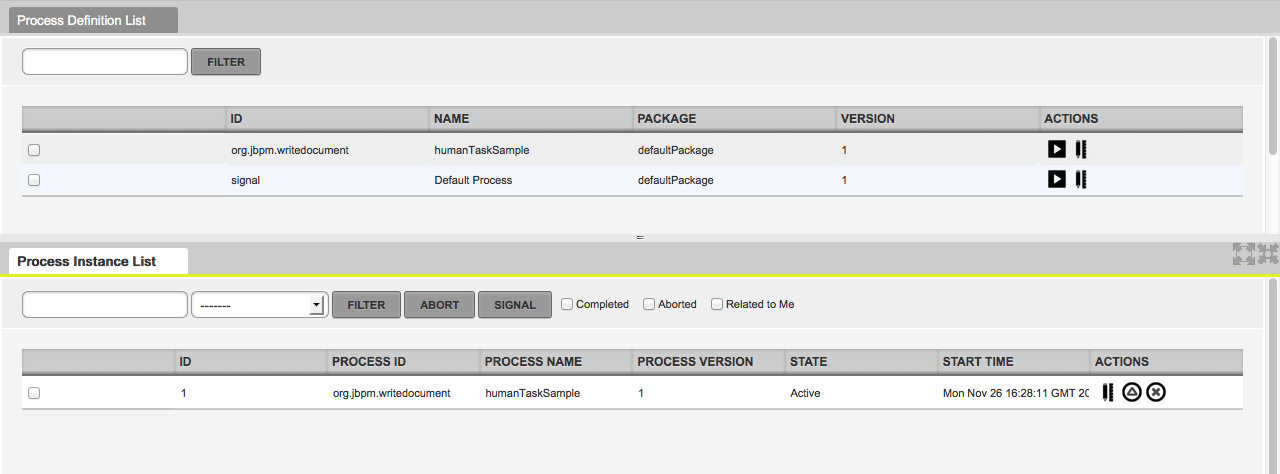The Process Management panels will allows us to see all the available Process Definitions and it will allows us to create new Process Instances. As you can see in the following screenshot, you will be able to inspect the Process Definition Details to see the process diagram and relevant information about each process.