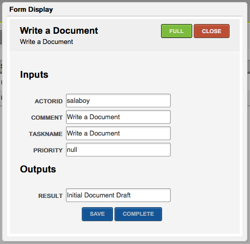 The current version allows us to interact with tasks via Task Forms which are dynamically generated based on the task content and the expected outputs. This task is already in progress, and for that reason you can see the Complete button on the bottom of the form. If the task is in a different state, different buttons will be displayed. As you can see the Save button will allow the user to store intermediate steps of the information that is being filled up inside the form. The Full button can be used to see the form with more contextual data, like for example Task Attachments or Task Comments.