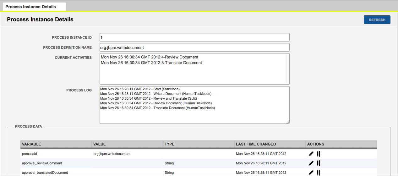 Inside the Process Instance Details you will be able to see the current status of the Process Variables, the activities that are being executed and also the Log for that particular instance.