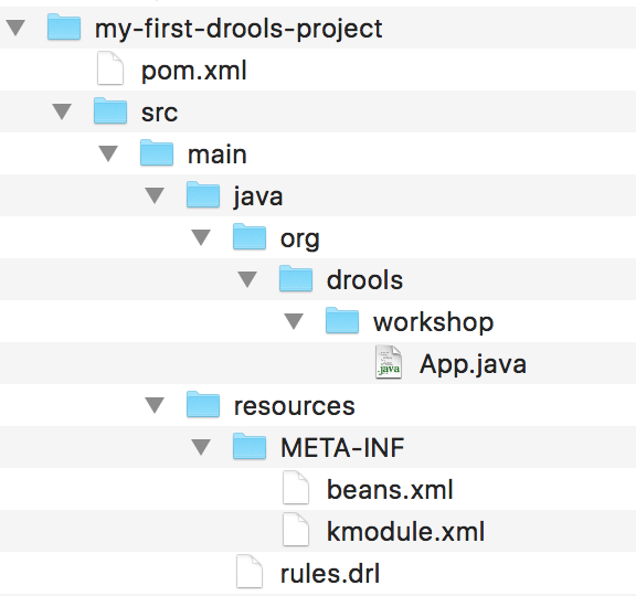 In order to run this class we still need to add three more things. First and mostly important, our rules! So let's go and create a new "drl" file under the src/main/resources/ directory (yes you need to create this directory). Let's call it rules.drl:
