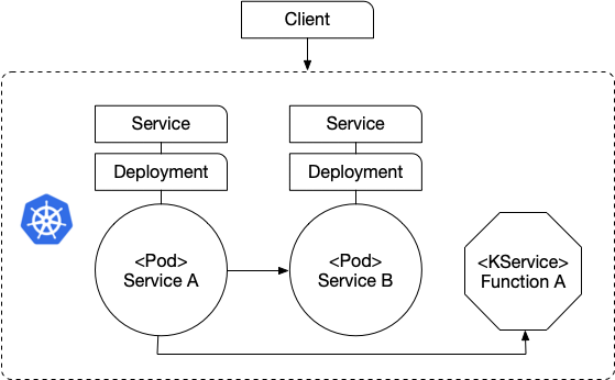 We deploy 3 services ServiceA, ServiceB and FunctionA. For this we use the Kubernetes native concepts of Service, Deployment(and ReplicaSet) and Pod. We also deploy FunctionA using a Knative Service.