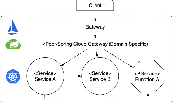 We introduce a Kubernetes Controller that understand about K8s Services. We are using the Spring Cloud Gateway with Spring Cloud Kubernetes. This allow us to create a router that look at the Kubernetes Service Registry and create a route per Service that it finds. This give us a single entry point and we only require to create a single Istio VirtualService.