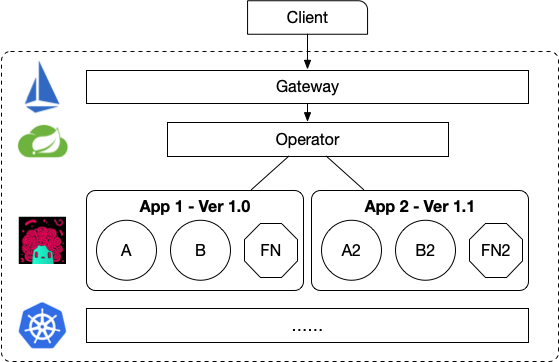 Now we need an Operator (component) that understand about these new Resources and manage their lifecycle (Creation, Updates, Deletion). As you can see now, the concept of Application is just a logical boundary between ServiceA, ServiceB and Function. This means that now we can introduce our Domain Specific logic to deal with how Applications are versioned and exposed to users. We can now differentiate between different set of services related to different applications.