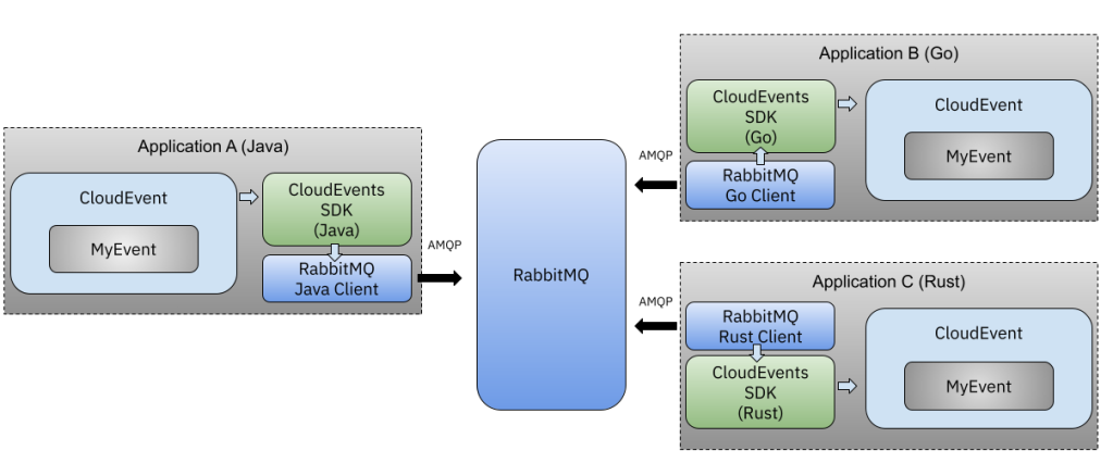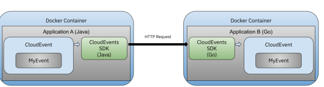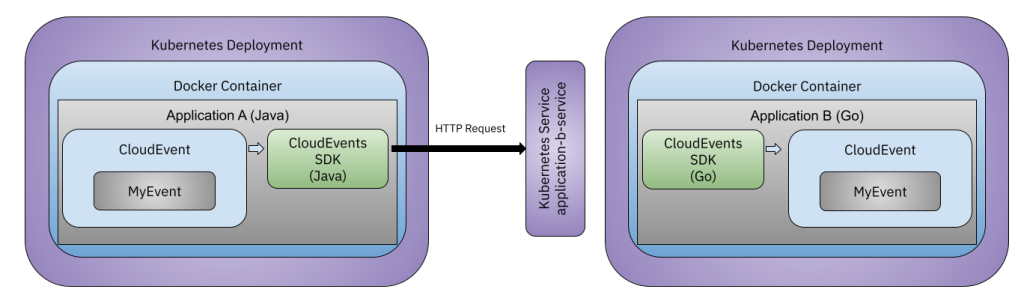 For both application's we will be using the CloudEvents SDK's in Java and in Go respectively. Both applications will produce and consume CloudEvents using the HTTP protocol binding. This means that we will be sending HTTP requests from Go and Java and the CloudEvents SDKs will be in charge of encoding our CloudEvent into HTTP requests. Each application will generate its own type of CloudEvent (app-a.MyCloudEvent and app-b.MyCloudEvent) but they will both share the same structure/class for the event payload/body.