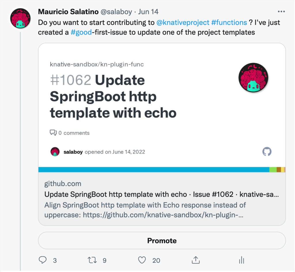 This week I've started a new initiative on the Knative Functions WG. I want to ensure that we bring new people to help us with our language templates; as we are mostly Java and Go developers, it will be great to have people from Node, Rust and Python helping us with our function templates. I am really looking forward to starting to create more advanced templates to make developers' live easier. To kickstart this initiative, I've created a couple of #goodfirstissue on the Knative Function repository and tweeted about them. I was surprised with the feedback. You can check the thread here: