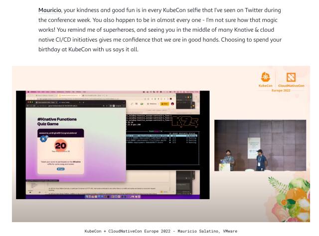This week I received a mention on the changelog.com blog by Gerhard (follow his podcasts here), and I am still shocked to see the mention with the other folks in that blog post. I love the fact that the screenshot used is from the Knative Maintainer track that we did with Carlos Santana at KubeCon Valencia (the Knative Functions Quiz Game was on the screen!. 🥳🥳🥳🥳🥳🥳)
