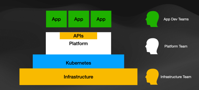 A new team, called the “Platform Team”, is separated from the Application Development and the Infrastructure teams. Their whole purpose is to build a platform that automates and brings the best practices from the infrastructure teams so they can be consumed by the Application Development teams using APIs as contracts. By exposing an API, the Platform team removes the burden from developers to know how to create and configure the required infrastructure for them to do their work.